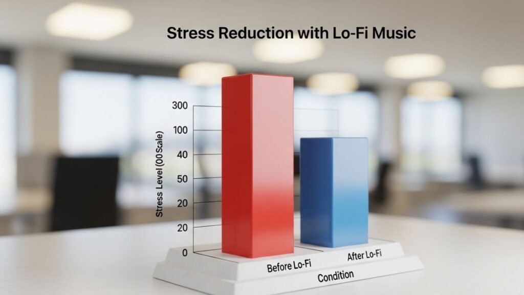 Na prática, quando falamos de Lo-Fi e Chillhop, observamos que o Lo-Fi atua como um “ruído rosa”. Diferente do ruído branco (que é linear), o ruído rosa tem frequências que diminuem à medida que a frequência aumenta, o que é mais agradável ao ouvido humano. Isso ajuda a mascarar distrações externas sem sobrecarregar o sistema auditivo. Estudos indicam que esse tipo de estímulo pode reduzir os níveis de cortisol (hormônio do estresse) em até 25% durante tarefas repetitivas .